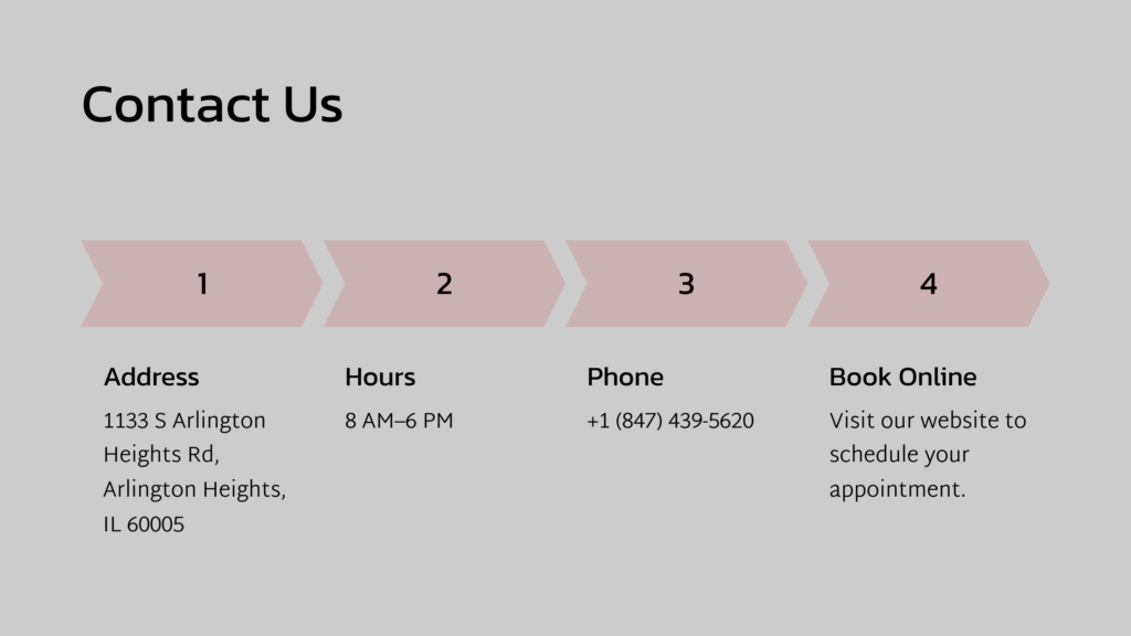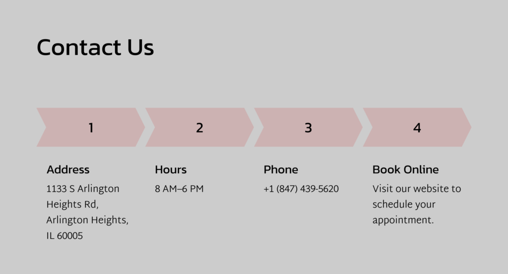 Address: 1133 S Arlington Heights Rd, Arlington Heights, IL 60005Timings: Mon-Fri: 8 AM–6 PM , Sat:8AM-4 pm, Sun: Closed